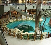 center with diverse shops & a dramatic water fountain in bright, chic